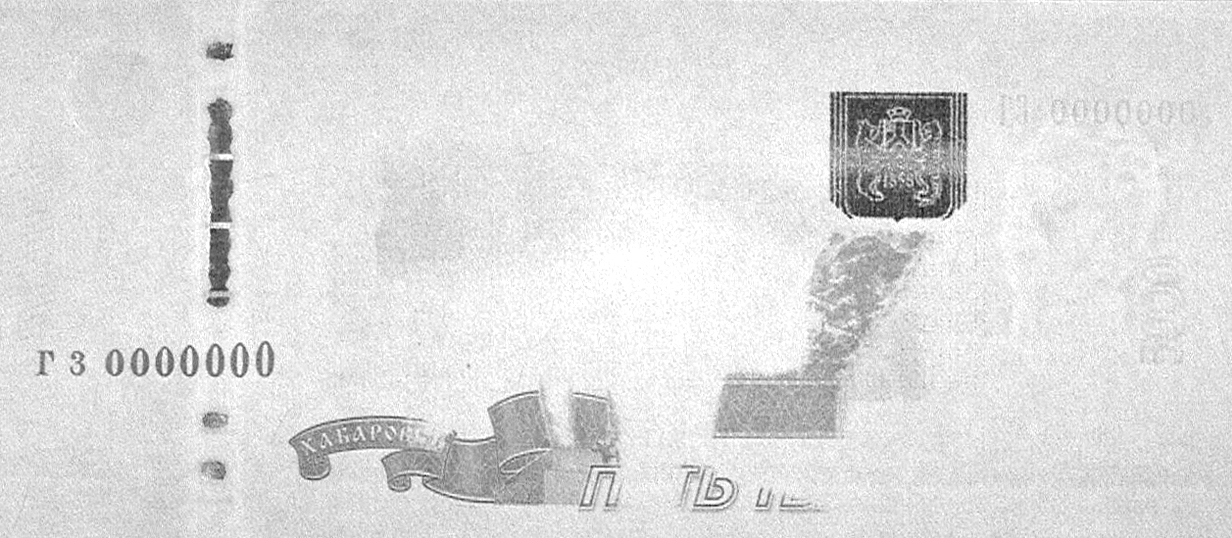 углом зрения в середине герба г. Хабаровска, при наклоне банкноты перемещается от