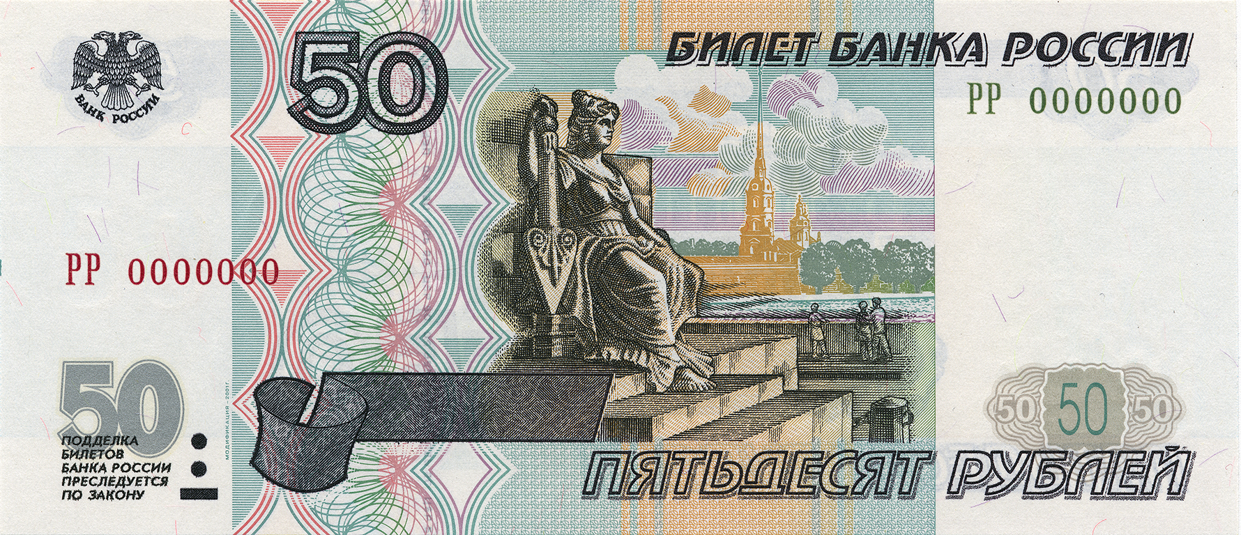 Банкнота Банка России образца 1997 года номиналом 50 рублей модификации 2001 года