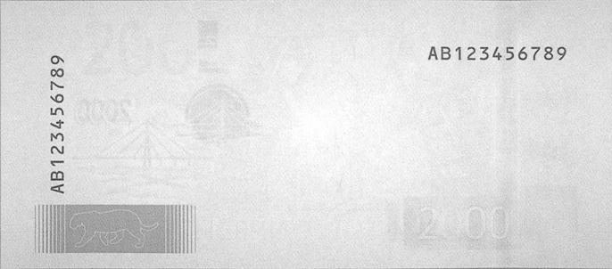 On the back of the note, there are two serial numbers that consist of two letters indicating the series followed by nine digits. The left number is printed on the short side of the note, the right number on the long one.