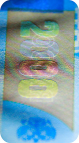 The banknote paper contains two types of security fibres: coloured, with alternate sections of red and blue, and grey ones.