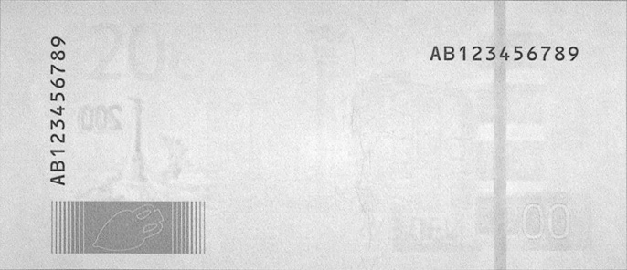 On the back of the note, there are two serial numbers that consist of two letters indicating the series followed by nine digits. The left number is printed on the short side of the note, the right number on the long one.