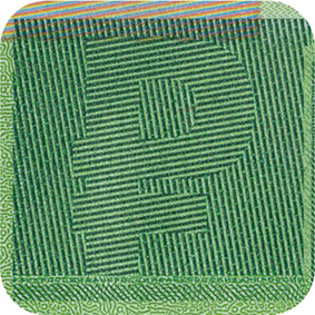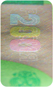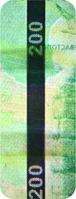 The banknote paper contains two types of security fibres: coloured, with alternate sections of red and blue, and grey ones.