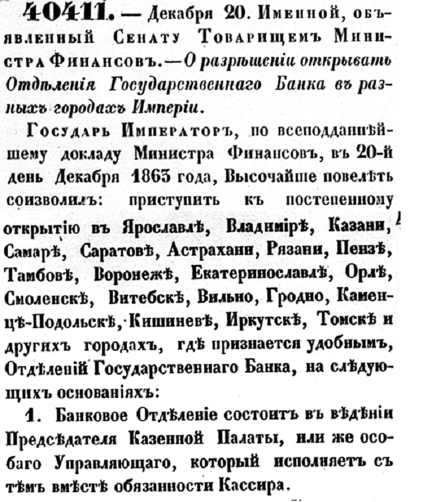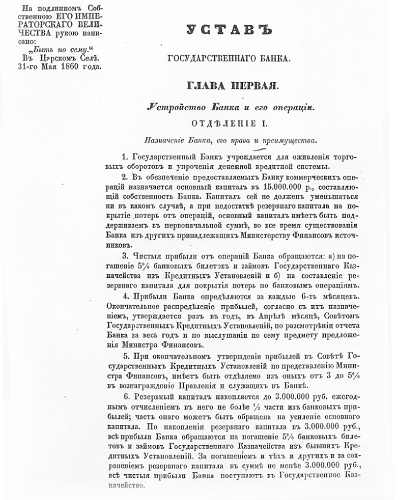 Поворотной вехой в развитии банковского дела в Российской империи является 1860 год, когда по указу Александра II, в целях «оживления торговых оборотов» и «упрочения денежной кредитной системы», был учрежден Государственный банк. Большую часть своих ресурсов в тот период Государственный банк вкладывал в государственные и гарантированные ценные бумаги, кредитовал торговлю и сельское хозяйство.